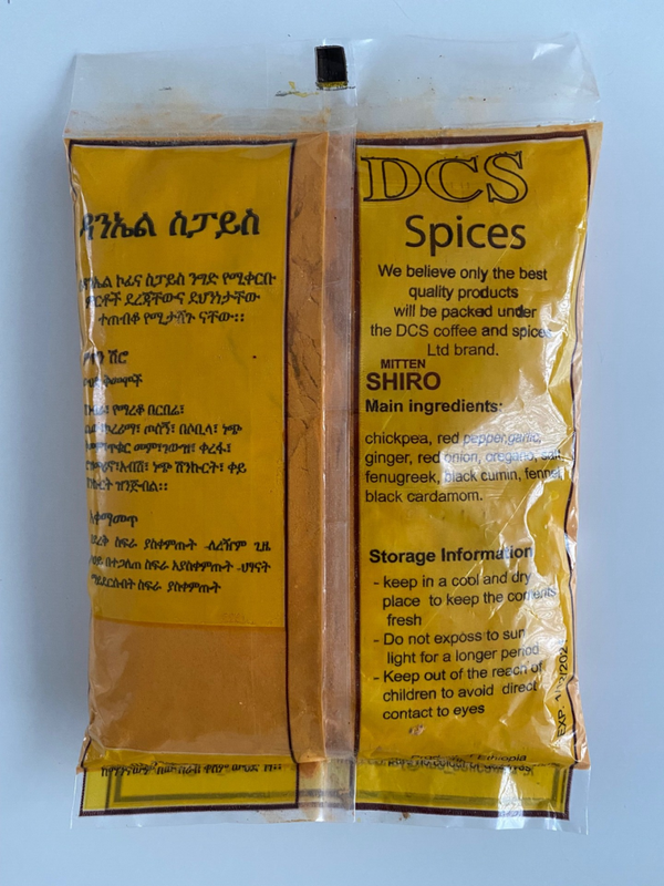 Shiro kruiden. Verpakking van 500 gram. Ingrediënten : kikkerwten, rode peper, knoflook, gember, rode ui, oregano, zout, fenegriek, zwarte komijn, venkel en zwarte kardemom.