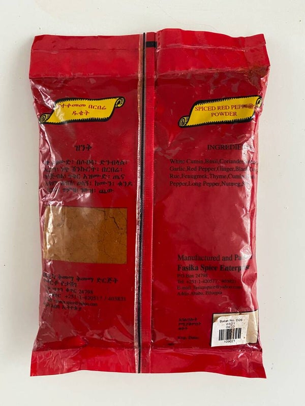 Ingrediënten : Witte komijnzaden, basilicum, koriander, korarima (= Ethiopische kardemom), knoflook, rode peper, gember, zwarte komijnzaden, fenegriek, tijm, normale komijnzaden, zwarte peper, lange peper, nootmuskaat en zout.